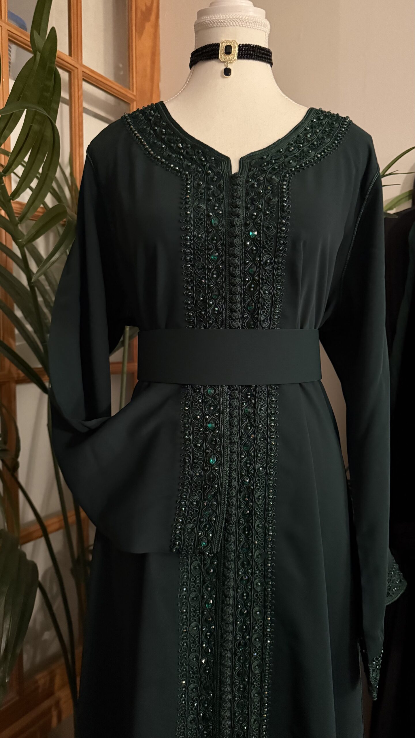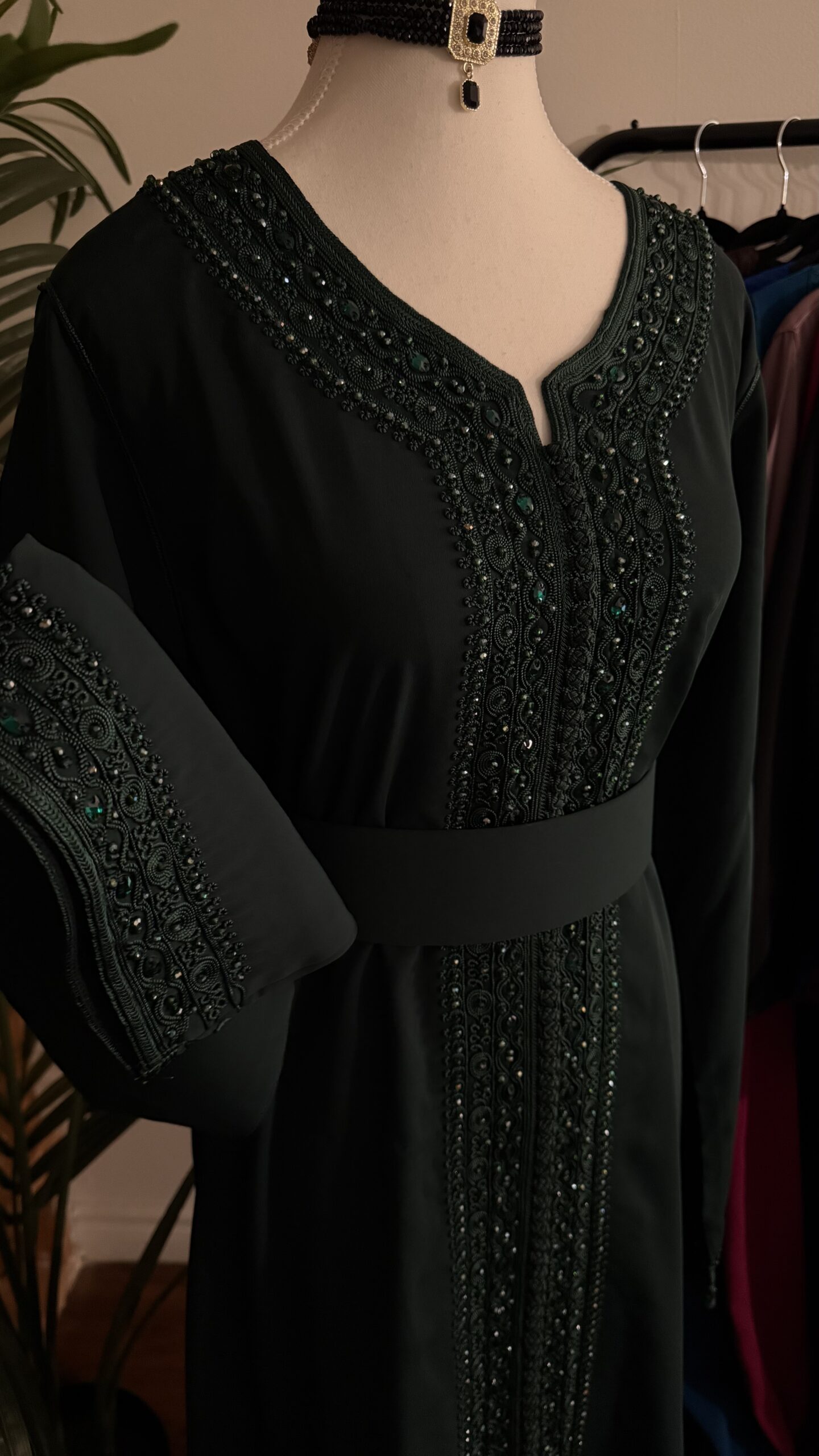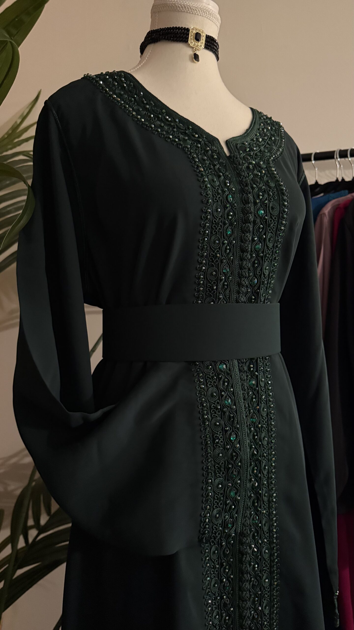 A statement in depth and refinement, the Green Emerald Caftan embodies timeless Moroccan elegance. Crafted in premium crepe, this piece flows effortlessly while maintaining a structured, graceful silhouette.