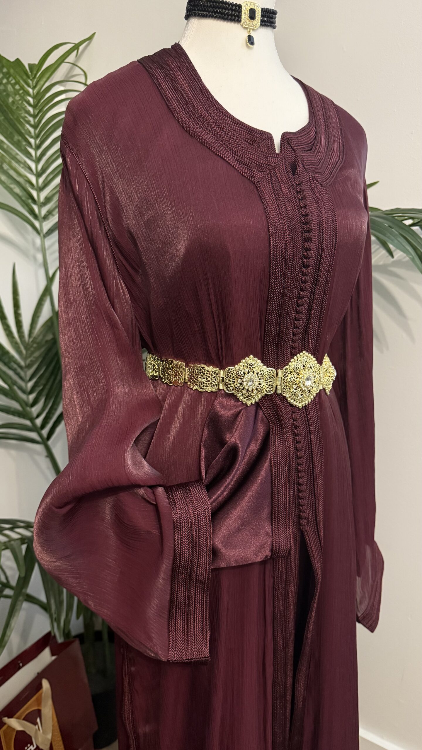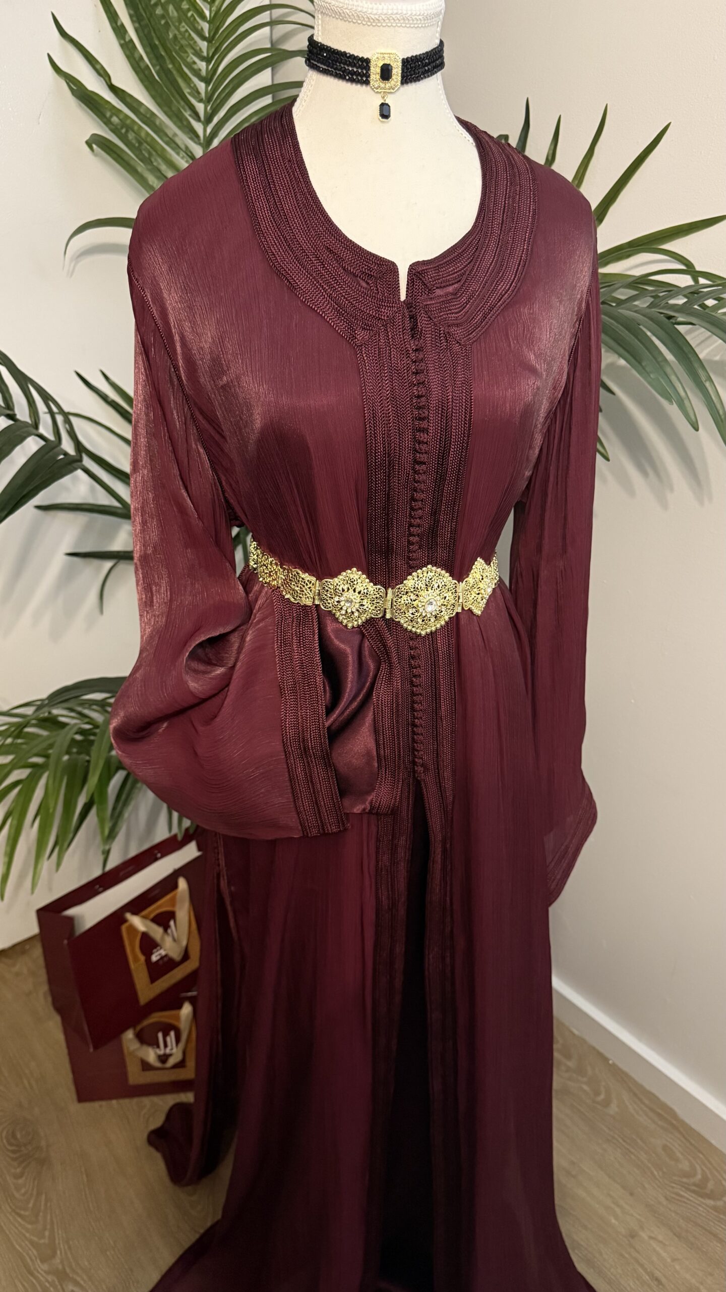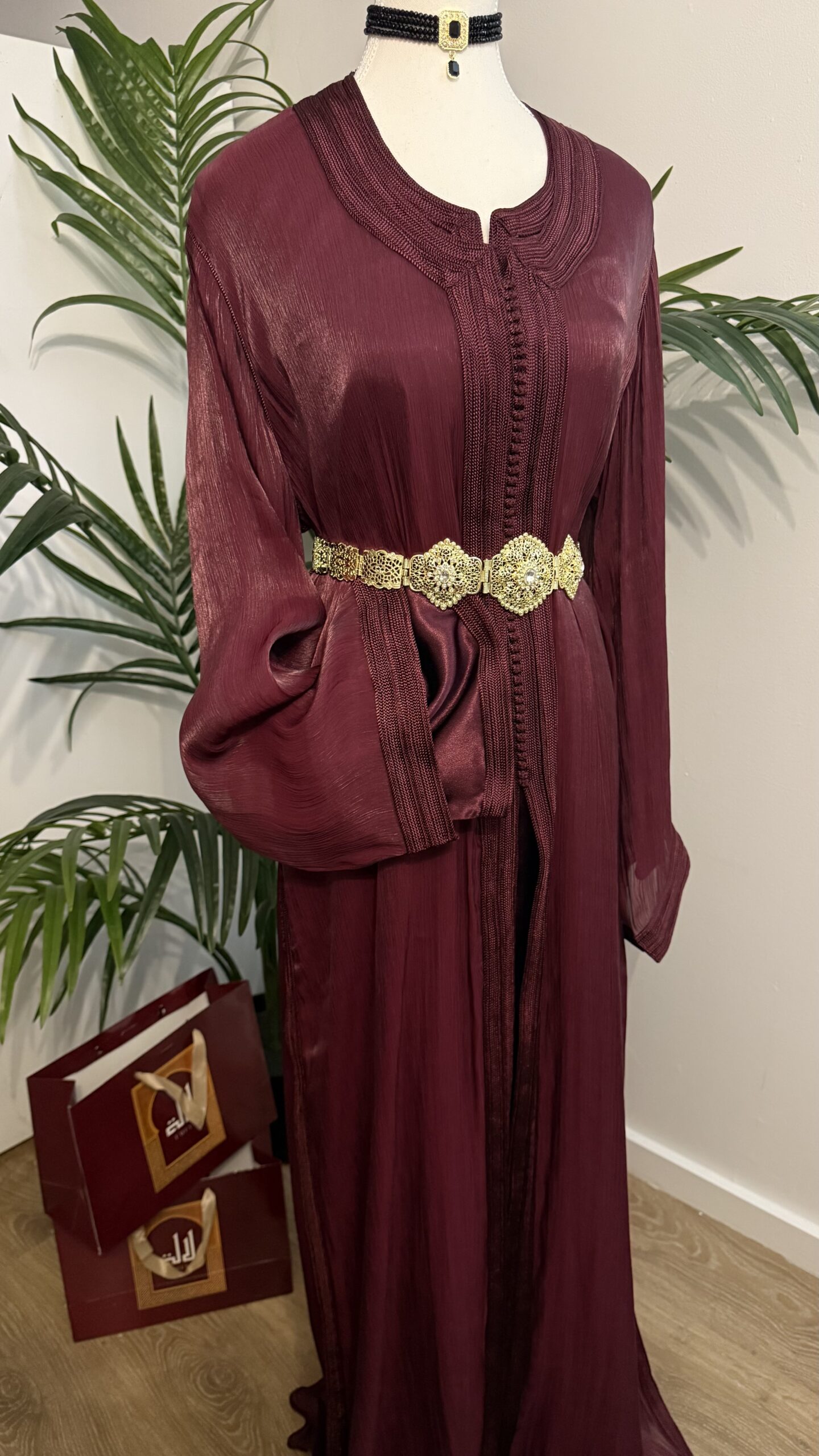 Step into timeless Moroccan elegance with our Burgundy Takchita, crafted in premium organza de soie with a soft satin de soie underpiece for luxurious flow and comfort.